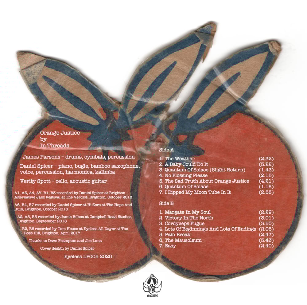 The debut album from In Threads “Orange Justice” has arrived, featuring improvised and spontaneous compositions that skirt around the edges of free jazz, psychedelia and outsider music. These pieces are joyful and exuberant one minute and deep and contemplative the next. The instrumentation is as free as the music featuring piano, bugle, bamboo saxophone and kalimba by Daniel Spicer, cello and acoustic guitar by Verity Spott and James Parson’s scattering restless drums. The Wire says: